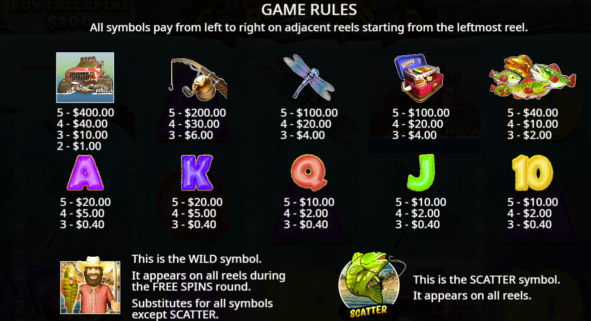 | Features | Scatter-triggered Free Spins, Fisherman Wild, Money-symbol fish, Multipliers, Bonus modifiers |